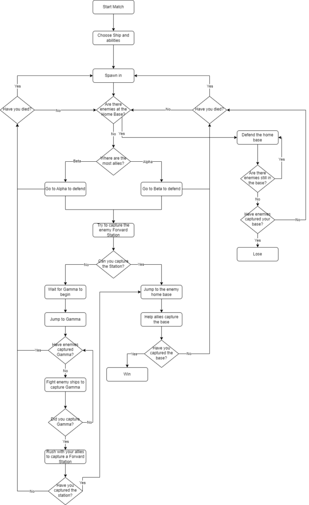 The first task for this week was to create a flowchart based on a the main gameplay loop of a game I have played. I chose Fractured Space as the main gameplay loop is mostly based off a 5v5 capture point gamemode. It has a few diferences, for example, the centre gamma sector is fought over to get massive buffs for the winning team, which can then be used to finish the game quickly.