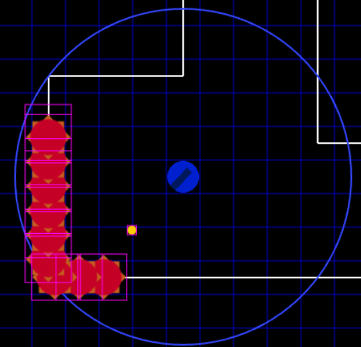 An axis-aligned bounding box is the most basic type of collision detection, being just a rectagle that can’t rotate and will scale to fit the whole sprite.